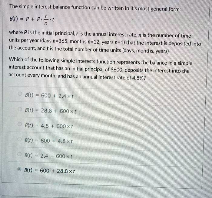 Solved The Simple Interest Balance Function Can Be Written In Its Most General Form B T P Where P Is The Initial Principal Is The Annual Interest Rate N Is The Number Of